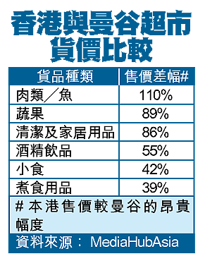 調查機構MediaHubAsia於去年十二月至今年一月,分析比較本港及曼谷超級巿場一百零一種貨品,其中沒有品牌的肉類產品如雞胸肉等,售價較曼谷的超巿高出四倍。國際品牌方面,家樂牌雞精在本港超市的售價是曼谷的兩倍多;雀巢粟米片貴九成六;Lipton茶包貴近九成;力士香梘貴八成八。