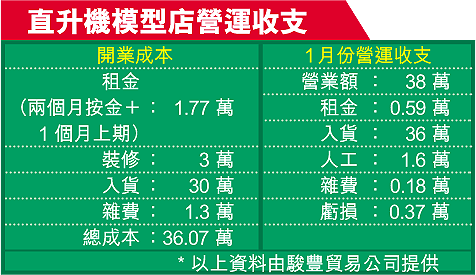 客量多並不等於利潤豐,因為貨源來價高,加上行內競爭大,所以平均毛利只有3%至5%。陳德鑫直言:「要增加銷量,先要擴大客戶層面。」店舖現時每月開辦兩班遙控模型機課程,4小時實習加理論的課程,費用680元,希望以較低廉的學費,吸引更多新血成為玩家,從而帶動日後的機件銷售額。