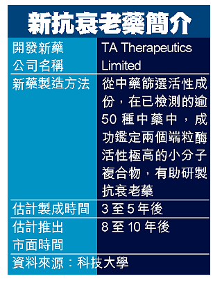 【本報訊】長生不老是不少人的冀望,香港科技大學正與美國一間生物科技公司合作,研究從中藥篩選活性成份,開發抗衰老及治療老人病的新藥,為人類締造不老的傳說。有科大教授估計,新藥可望於三至五年內製成,再經過長時間臨床實驗後,八至十年後即可推出市面發售。 記者:盧文烈