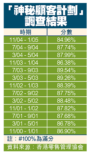 【本報訊】「今時今日咁嘅服務態度係未夠㗎!」隨着本港經濟復甦,零售業的服務態度轉差。香港零售管理協會測試零售業服務水平的「神秘顧客計劃」最新結果顯示,去年十一月至今年一月季度的零售行業平均成績為84.96分,創○一年以來的新低。有學者認為,調查反映本港零售業服務質素差勁,銷情一旦暢旺,銷售員就怠慢顧客。 記者:蔡朗清