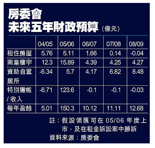 此外,房委會昨公布未來五年的財政預算,該會財務小組主席鍾瑞明表示,今年錄得五億元盈餘,累積結餘增至一百三十二億元,較原先預算的增加近三倍。他指出,若領匯能在○五/○六年度上市,加上租金訴訟案勝訴,房委會在○五/○六年度結餘會進一步增至四百一十億元。