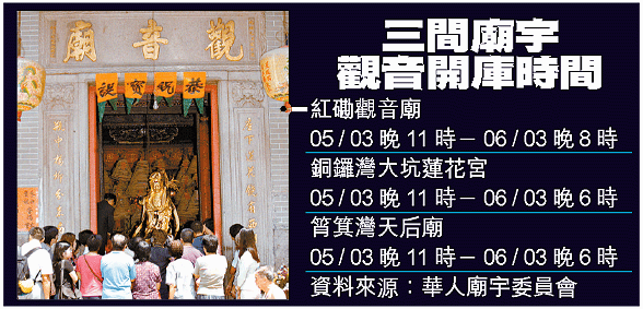 【本報訊】傳統正月二十六日為觀音開庫,市民想在新的一年發大財,可身穿綠色衫褲,於本周六(三月五日)深夜十一時至翌日凌晨一時到紅磡觀音廟、銅鑼灣大坑蓮花宮及筲箕灣天后廟等廟宇向觀音借庫。