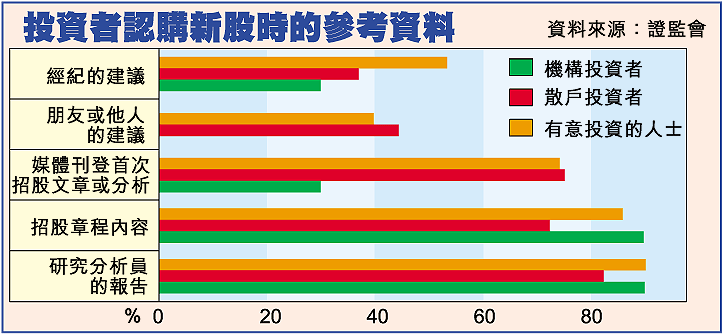 結果又顯示,72.4%的散戶及86.1%的有意投資人士,認為招股書是作出投資決定的重要資料來源(見圖),逾八成依賴分析員的研究報告,逾七成認為在媒體刊載有關新股的文章及分析是重要參考資料。而100%的受訪機構投資者認為,招股書及分析員報告是重要資料來源。