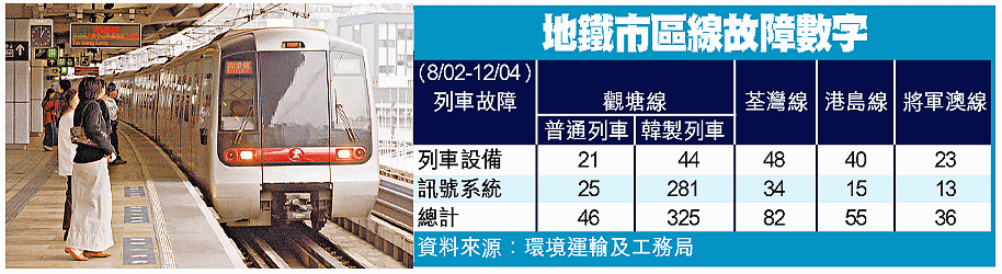 環境運輸及工務局向立法會交通事務委員會提交的文件顯示,地鐵於○二年八月至○四年十二月的二十八個月期間,發生因設備故障而令列車服務受阻五分鐘或以上的個案,共有五百四十四宗,平均每月有十九宗,其中觀塘線最多,佔六成八,其次是荃灣線、港島線、將軍澳線,分佔一成半或以下。