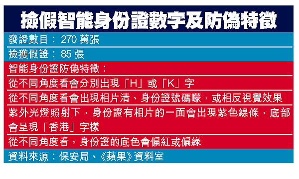 入境處至今已簽發了二百七十萬張智能身份證,李少光回答議員質詢時稱,目前發現的八十五張假智能身份證,有二十八張由黑工持有,持假智能身份證的黑工,佔去年捕獲黑工總數的百分之零點五。他強調,假智能身份證的手工差劣,仿真度極低。資料顯示,入境處過去撿獲的假證,假得連英文簽發日期也串錯,英文性別資料也不對。