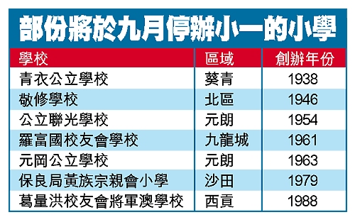 今年有二十二家小學因新學年小一收生不足二十三人,九月起不能再開辦小一。包括將軍澳在內的西貢區,今年有兩家小學被殺,其中包括八八年創校的葛量洪校友會將軍澳學校,是區內第二年有辦學只十多年的小學被殺校。該校是有關校友會所辦的第三家小學,校董會成員包括民主黨立法會前議員司徒華。該校及司徒華昨日未有回覆查詢。