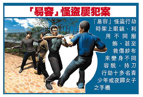 【本報訊】百變「易容」賊利用不同服飾、甚至救傷紗布來變身不同容貌,涉嫌過去三個多月於屯門青山區,持刀行劫十多名青少年或夜歸女子的手機及財物,警方根據大廈閉路錄影帶,前晚在安定邨拘捕涉嫌正準備再次犯案疑人,在他住所及寶田中轉屋外花槽,搜出涉案利刀及用以變身之眼鏡及衣物。 記者:區恩傑