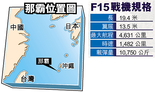 日本繼把中國列為軍事威脅和將台海危機列為美日共同戰略目標後,再有新動作。針對中國軍事現代化,日本防衞廳周四決定由二○○八年起,在沖繩那霸航空自衞隊基地部署F15戰機,取代老化的F4戰機;並準備在五月首次參與國際軍事演習,凸顯自衞隊走出國外。