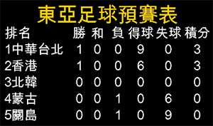 至於頭場揭幕戰,東道主中華台北以九比○大勝關島,目前以較佳得球數字,力壓同得三分的香港登上小組榜首。