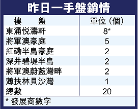 由於現時發展商開售新盤的定價,已大大超出二手市價,不少用家對購買一手樓已抱審慎態度,將軍澳豪庭上周日內購售出逾百單位後,銷情立即轉淡,昨日下午雖陸續都有不少人士參觀示範單位,但肯落實買樓的人很少,整日只約售出5個單位。另外,長江實業(001)高級營業經理劉啓文表示,昨日售出8個東涌悅濤軒第10座單位,公司有意本周調高售價2%至5%。