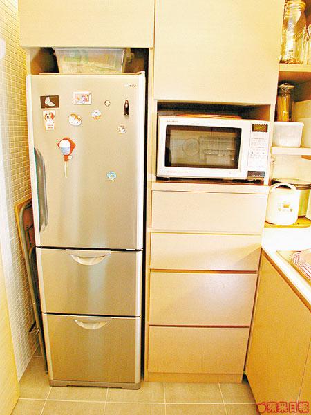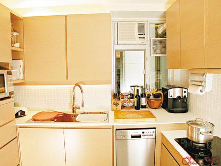 由於客飯廳間隔要重新改動,廚房面積比原有縮小了一半,為了善用空間,自然要將間隔重新設計,故內裏的配套如廚櫃和電器,全部都要度身訂做。