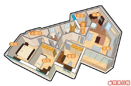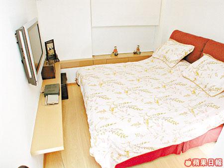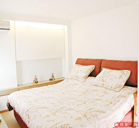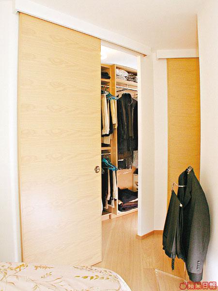 主人房三尖八角難擺位,如果將衣櫃貼牆擺放,便會構成一個三角形的突兀凹位,影響外觀又浪費。設計師遂間上一個衣帽間,遮掩着呈斜三角的牆身,除了令房內間隔更四正,衣帽間容量夠大,可以放更多衣服。