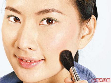 4.在顴骨以下,較低位置掃上啡色胭脂。再在突出的顴骨位加啡黃色Luminizer,加強Shimmy效果。
