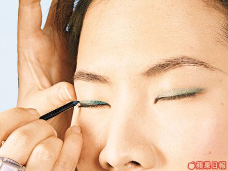 2.以一條粗身的孔雀綠色眼線代替平日的眼影,尾部呈尖長形,近眼眉的部份塗上淺啡色做Highlight。