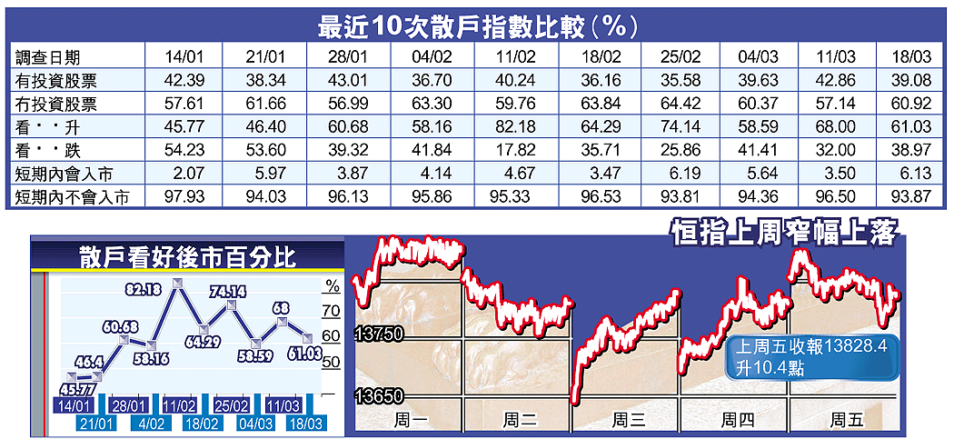 本報上周五晚所做的散戶指數電話調查顯示,136名有投資股票的市民中,只有61.03%看好本周港股後市,比例較之前一周的68%為低。至於沒有投資股票的市民,入市意欲則上升,上周212名被訪者中,只有6.13%表示短期內會入市,高於對上一次的3.5%(見表)。