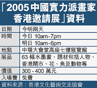 【本報訊】繼法國印象派畫家的經典畫作、珍貴的盛唐文物相繼在港展出,市民在今、明兩天又有機會免費欣賞由中國實力派畫家繪畫的六十三幅總值約四百萬元的水墨畫。由香港文化藝術交流協會舉辦的「2005中國實力派畫家香港邀請展」昨起一連三天於中環大會堂舉行,展出六十三幅以人物、香港鬧市及動物等為主題的水墨畫。