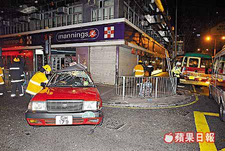 車禍發生於昨晨四時三十分,姓馬的士司機(六十歲)駕駛的士載着菲籍女乘客,沿菲林明道向軒尼詩道行駛,駛至與駱克道交界的交通燈位時,遭一輛沿駱克道往西環的載客小巴攔腰猛撼,的士被撞至失控打轉,車尾擱在行人路,車身嚴重凹陷,後座女乘客被困,需由消防員撬門救出。