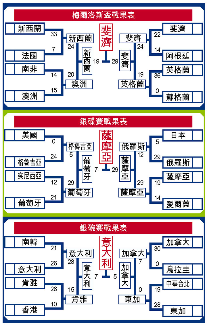 至於銀碟賽方面,薩摩亞以二十九比七擊敗葡萄牙,成為銀碟冠軍得主;而意大利以兩分之微險勝加拿大,奪得銀碟錦標,比分為七比五。