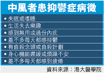 香港大學醫學院在去年六月至十二月進行全港首個中風病人患抑鬱症的研究,發現在受訪的一百零八個首次中風病人中,有三成出現失眠、對生活失樂趣及煩躁不安等抑鬱症病徵,因而推算出每年有一千八百名首次中風病人患上抑鬱症,情況令人關注。
