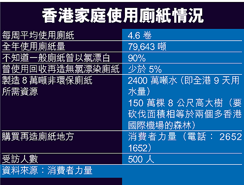 「消費者力量」今年初以電話訪問了全港五百個家庭,結果顯示,每戶每周平均耗用四點六卷廁紙,以此推算,全港家庭年用廁紙量為七萬九千六百四十三噸。逾九成五被訪者都使用潔白柔軟、由木材生產的廁紙。