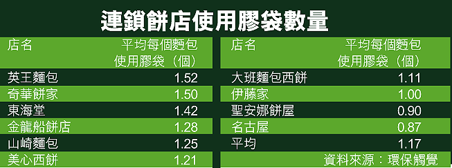 調查顯示,只選購一個麵包的顧客,平均用上一點四二個膠袋。十間連鎖店中,以英王麵包最不環保,每個麵包平均使用一點五二個膠袋包裝,購買數量愈少愈不環保,若顧客只購買一個麵包,店員會平均用一點九一個膠袋。其他如奇華、美心及大班,也平均使用超過一個膠袋包一個麵包。