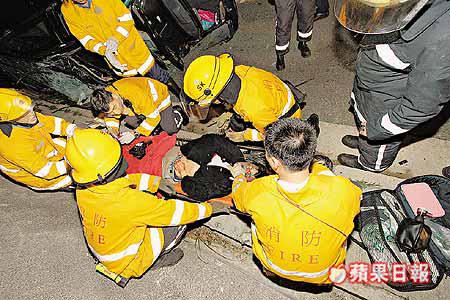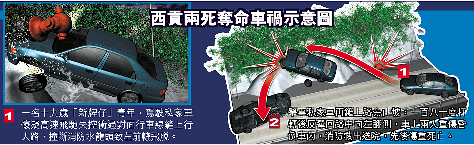 【本報訊】西貢斬竹灣昨凌晨發生兩死奪命車禍,一對同是十九歲的「沙煲兄弟」遊車河樂極生悲,其中僅擁九個月駕駛經驗的「新牌仔」駕車入彎後在直路高速飛馳失控,衝過對面線鏟上行人路撞斷一個消防水龍頭後,私家車車轆飛脫再撞山打轉全車翻側毀爛。新牌仔當場死亡壓在重傷好友身上,傷者送院搶救亦於七小時後傷重不治。 記者:黃曄寧、伍浦鋒、杜建彬