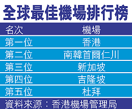【本報訊】國際航空運輸協會及國際機場協會首次合辦的AETRA全球最佳機場調查中,香港國際機場擊敗四十七個對手,成為商務及消閒旅客心目中的全球最佳機場。韓國的首爾仁川機場及新加坡機場分別屈居亞軍及季軍,而吉隆坡及杜拜機場分別位列第四及第五位(見表)。