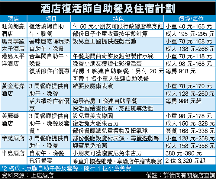 除自助餐外,部份酒店亦推出復活節住宿優惠。香港黃金海岸酒店發言人表示,房客可免費參加「快活蛋」繪畫比賽、烹飪班或手工藝製作班。