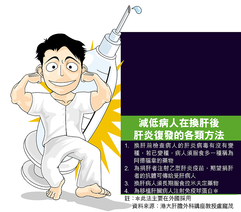 港大醫學院肝膽外科講座教授盧寵茂接受訪問時表示,本港去年有七十六宗肝臟移植手術,今年料手術個案增至九十宗,當中八成換肝病人是乙型肝炎患者,若不採取預防措施,換肝後病人血液內的乙肝病毒會破壞新肝的功能,在三至六個月內,乙型肝炎便會復發。
