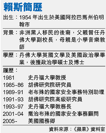 作為美國首任黑人女國務卿的賴斯,與其前任、軍人出身的鮑威爾截然不同,她是一位擁有政治學博士學位的東歐問題專家,是一個學者型的官員,早在一九八九年便出任老布殊的國家安全委員會蘇聯事務顧問,因此與布殊家族建立深厚的友誼,贏得現任總統布殊的信賴。