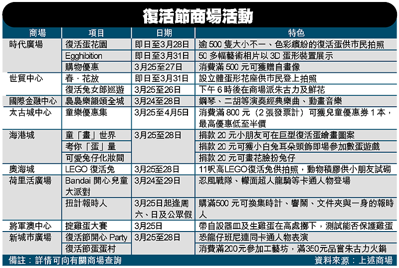 【本報訊】一連四天的復活節假期,不少港人選擇留港消費,各商場推出林林總總活動吸引人流。有商場擺放巨型LEGO兔或蛋形花座等供顧客拍照;有的派出復活兔女郎或卡通人物網羅大小客人;也有商場舉行「掟雞蛋」益智遊戲。有商場預計,今年復活節人流可望較去年有至少一成增長。 記者:蔡朗清