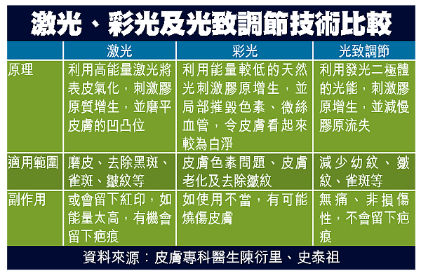 皮膚專科醫生陳衍里表示,激光、彩光等光能療法均透過將光能轉化為熱能,然後破壞皮膚的膠原、水份或血管,從而改變皮膚外貌,達到去除皺紋、減退雀斑等效果。而光致調節則利用發光二極體(LEDs)輸送比激光弱一百倍的光能,刺激皮膚的纖維細胞,使細胞製造更多膠原質,同時亦減慢膠原質的流失,因而減少眼部皺紋。