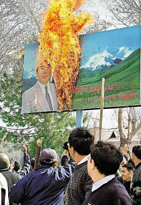 示威者跟着在市內廣場焚燒阿卡耶夫的廣告板。反對派人士泰凱巴耶夫說,「這是我們歷史的新一天」,另一名領袖說:「人民已接管了奧什市」,反對派會在全國各地另起爐灶成立政府。