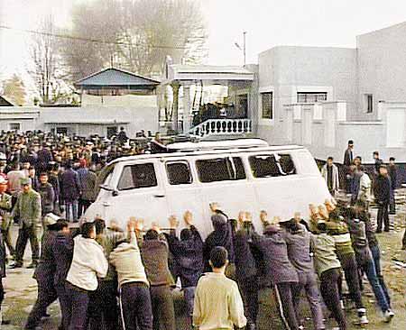 另一城市賈拉勒阿巴德周一再有一萬五千人上街,未有發生暴力事故。示威者在機場跑道布亂石陣,令保安部隊難以趕來增援。在之前一日的衝突,示威者火燒警察總部、救出七十名被捕的示威者,警方向示威者開槍仍未能阻止市長辦公室失陷,反而激起示威者的怒火,把四名警員打死。俄羅斯傳媒指死亡人數為十至十六人。對於警員開槍,總理塔納耶夫說:「警隊沒有橡膠子彈和催淚氣,連警棍也不夠。」