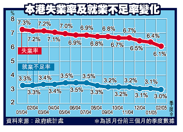 【本報訊】本港失業情況大幅改善,港府公布去年十二月至今年二月的最新失業率是百分之六點一,較上月公布的數據明顯下跌零點三個百分點,是過去十五個月以來的最大跌幅,失業率也創過去三十九個月新低。財政司司長唐英年表示,僱員的工資開始輕微上升,他們的議價能力也會隨着失業問題的改善而愈來愈高。