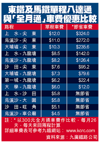【本報訊】馬鞍山鐵路及尖沙嘴支線通車後乘客量偏低,九廣鐵路宣布由下月起推出東鐵及馬鐵「全月通」搶客,月票售價三百元,持票者可在一個月內無限次任搭東鐵及馬鐵,不包括羅湖及馬場站,長程常客每月可節省達三百多元車費。但東鐵即日來回八折優惠將於五月尾取消,短程及並非每天乘搭的乘客將需付較多車資,「全月通」亦不會有尖東站轉乘地鐵的一元五角優惠。有團體批評九鐵借推出月票取消優惠是變相加價。 記者:麥志榮 黃秋豪