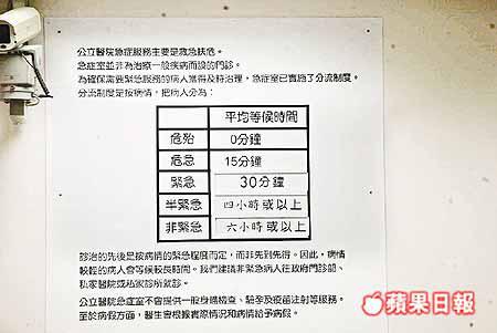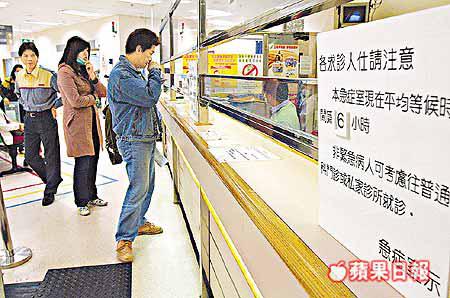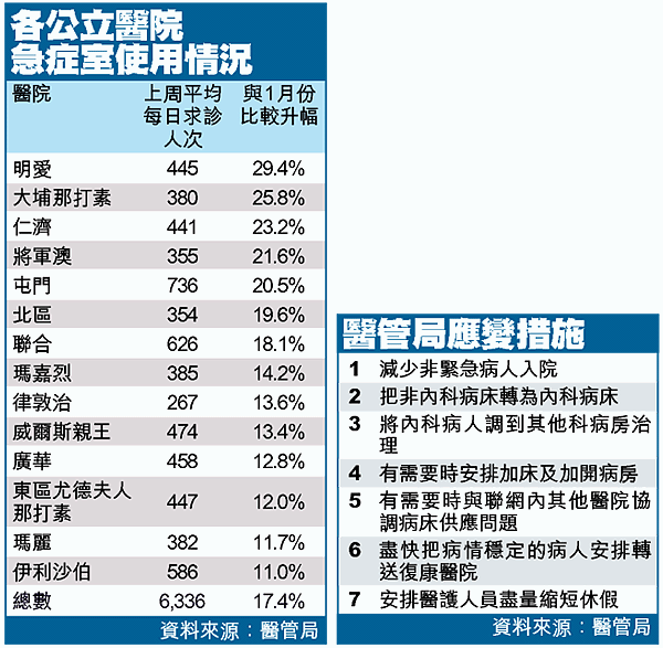 【本報訊】本港爆發五年來最嚴重的流感潮,踏入三月,各公立醫院急症室的求診人數急升近兩成,「迫爆」各醫院的內科病房外,被列為非緊急類別的求診者,更需苦候六小時或以上。醫院管理局須緊急制訂應付病人急增的措施,包括減少非緊急病人入院、增加病床,以及安排醫護人員縮短休假等。有急症室醫生指出,近日求診病人的病情較以往嚴重,有多達三分一的內科入院病人均呈肺炎等呼吸系統毛病,較過往急升一倍。 記者:梁洵瑜 陳倩雯 馬耀文
