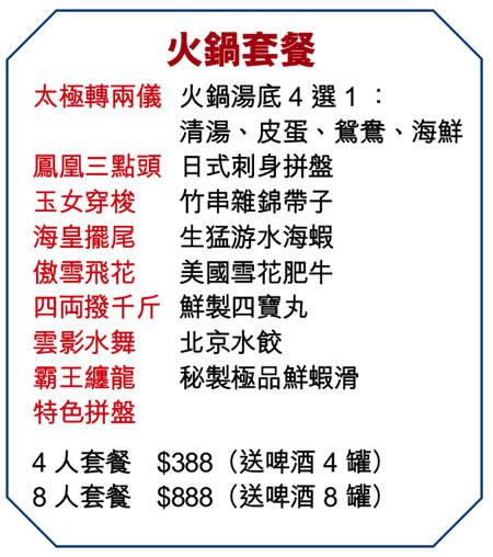就是一句「唔打唔知咁好打」的電影宣傳語句,電影公司與福苑便將邊爐與電影來個合作,推出「喜武火鍋套餐」,一於讓觀眾睇完武打戲,再來「打」邊爐。今次是福苑首次推出火鍋套餐,套餐分開四人及八人份量,食物包括有肥牛、刺身、手打肉丸等多款碟頭食物,全套用上武功的招式名稱,另外還跟一個如盆菜般的海鮮肉類拼盤,四人餐一盤,八人餐兩盤,食物種類多多。