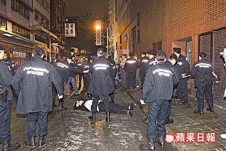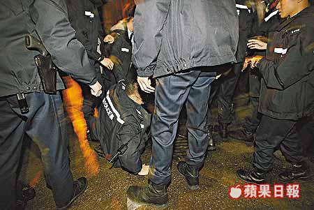 【本報訊】被警方以罪案頻仍為理由曾反對延續牌照的油麻地348的士高,昨凌晨發生襲警事件。警方一隊機動部隊(俗稱PTU)聯同刑偵處人員到場查牌期間與自稱的士高職員發生衝突,有人不忿被警長查閱身份證,囂張喝叫:「查我身份證?你未夠班!係咪想博出位呀?」混亂中雙方各有一人被推跌落地,各自急召增援,群情洶湧。更有大漢模仿警方,用手提攝錄機拍攝衝突過程,現場一度聚集逾百人,場面幾乎失控。最後警方拘捕四人涉嫌襲警及阻差辦公。 記者:黎志偉、伍浦鋒