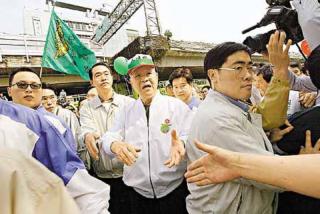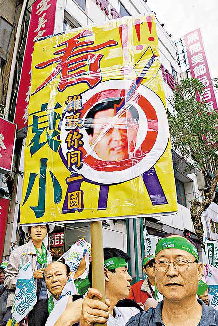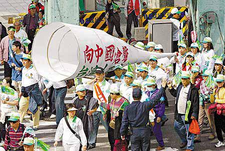 為抗議北京制訂《反分裂國家法》,台灣總統陳水扁昨不理黨內外的反對,破天荒上街遊行。陳水扁穿上避彈衣,在五層由五百名軍警、憲兵組成的「人肉城牆」貼身保護下,帶領女兒、女婿以及外孫,參加該場號稱台灣歷來最大規模的遊行集會,在台北街頭遊行二十四分鐘,成為「中華民國」首名上街遊行的總統。即使在世界各國,也鮮有國家元首上街抗爭。 中國組