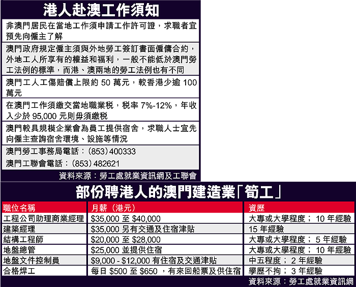 【本報訊】澳門建造業求才若渴,當地勞工事務局估計未來三至五年內可吸納三萬名香港建築工人;面對即將有大批港人赴澳「搵食」,澳門政府將會加強措施保障香港工人,除了規定香港建築工人每日工資不能低於四百五十元外,日後港人赴澳工作亦必須透過當地勞務公司轉介。本港勞工處上月初推出的澳門就業資訊網站,目前刊登約四十個澳門職位空缺。 記者:盧文烈