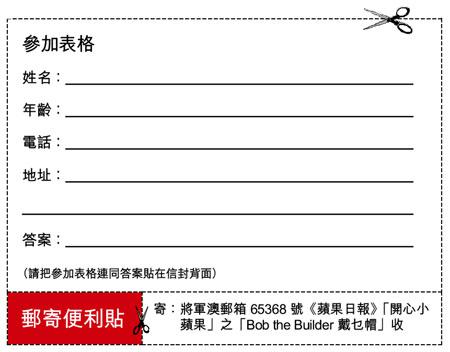 參加辦法有兩個,第一個是在新世界中心兩間或以上的店舖消費滿$600(每張發票之金額不可少於$100),就可以得到「工程卡」(遊戲券)乙張,一次過玩盡場內各式活動及遊戲。憑工作卡參加場內每一個項目,均可獲得蓋印一個,集齊5個蓋印,即可額外獲贈BobtheBuilder創意紀念品乙份。另一個方法就要考吓你的記憶,圖中BobtheBuilder的安全帽,原來的顏色是甚麼?請於明天(3月28日)上午十時起,將參加表格傳真至27420542,首25名答中的小朋友將有機會獲得由新世界中心送出的BobtheBuilder工作卡乙張,在4月2日或3日親臨新世界中心玩玩遊戲贏獎品!