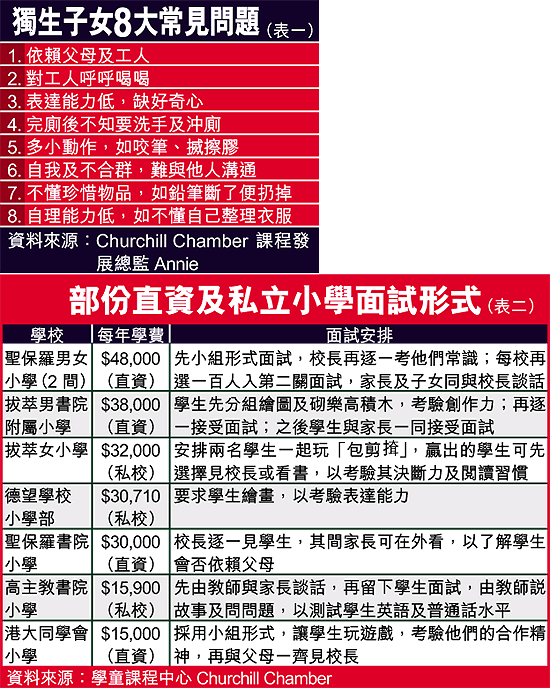 學童課程中心ChurchillChamber昨舉行兩場小一入學面試講座,共有百多名家長出席,主要是本學年幼稚園低班(K2)學生的家長。中心課程發展總監Annie歸納八項獨生子女常出現的行為問題(見表一)。她指出,不少中產家庭的獨生子女都是由外傭照顧,又備受父母鍾愛,故自理能力較低,如整理衣服、沖廁、執拾玩具都不會,連除「魔術貼」鞋都假手於人。