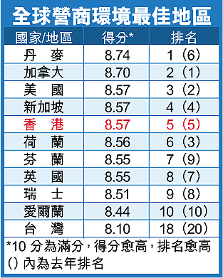 另外,經濟學人亦公布最新全球營商環境排名,香港繼續保持第5名(見表)。