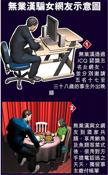 根據案情,被告透過ICQ認識五名女網友,並於二月二十四日至三月五日期間,分別邀五名十七至三十八歲的事主共用晚膳,被告每次均在席上向事主借用手提電話,並走到食肆外講電話,然後逃去無蹤。被告於三月七日致電鴻星海鮮酒家位於堪富利士道的分店,並以同一個手提電話號碼訂位,由於該集團早已將有關騙案的通告在內部傳閱,該分店經理曾少娟(譯音)遂立刻通知警方,便衣警員在酒家內守候。