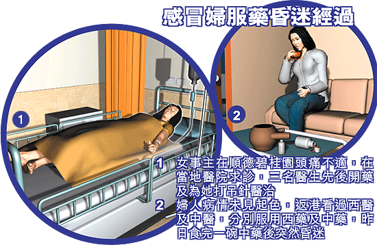 陳婦食藥仍不能止頭痛,於是向一名相熟中醫求助,他開了一劑藥聲言「瞓一覺出一身汗」便無事,但到昨晨仍未見好轉,中醫師再開多一服藥。昨晨十一時許,趙煎藥給妻子服食,在飲了半碗後,其妻登時滿身大汗,飲完另外半碗藥後更休克昏迷,心跳曾一度停頓,他見狀大驚立即報警,救護員到場搶救,陳婦送院搶救後仍昏迷不醒,情況危殆。