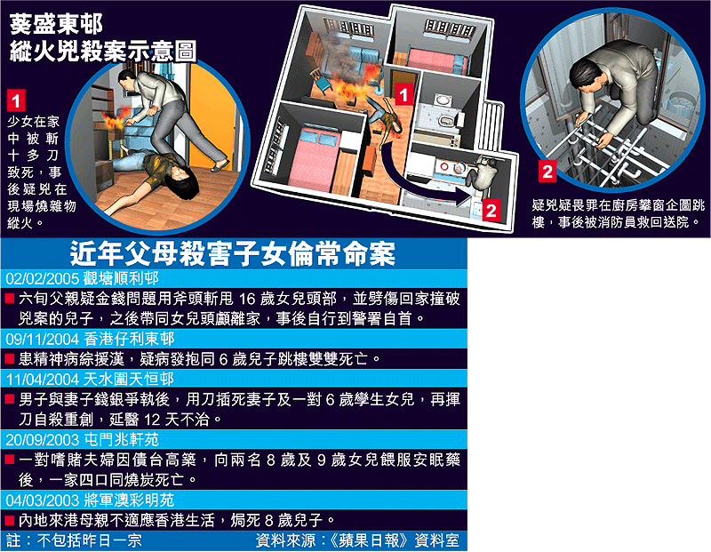 【本報訊】葵盛東邨一個平日相處融洽的三口之家,昨日發生縱火殺女倫常慘案,一名沒有精神病紀錄的失業父親,疑精神突然出現問題,向二十歲女兒亂刀揮斬,女兒頭頸共中十多刀當場慘死,事後疑兇在家中縱火及疑畏罪攀窗企圖跳樓。消防員接報到場將火救熄,並救回企圖跳樓男子,他吸入大量濃煙被送院治理,目前情況嚴重,警方將案列作兇殺案處理。