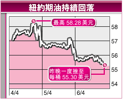 紐約原油5月期貨昨天一度跌74美仙(1.32%),低見每桶55.30美元;倫敦布蘭特原油5月期貨曾跌84美仙(1.52%),至54.60美元。紐約期油周一創下每桶58.28美元的歷史新高。