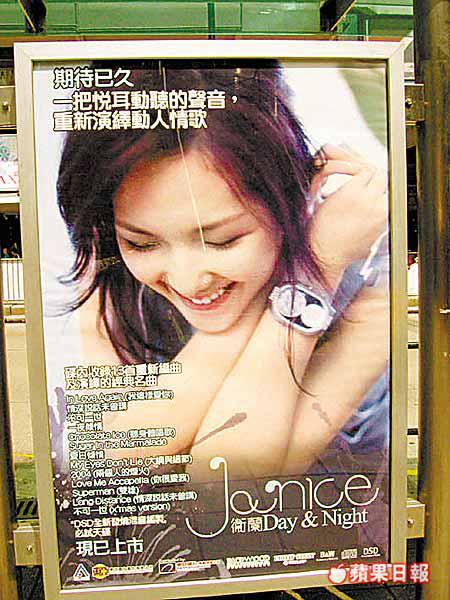 黎明早前捧咗個叫Janice嘅女歌手,幾個月嚟都只係聽到佢嘅歌,就未見佢過樣,搞到人哋以為佢個樣麻麻哋。噚日馮仁昭經過尖沙嘴巴士站,終於見到Janice嘅廣告牌,原來佢叫做衞蘭,聽聞佢下星期三重會開一個迷你音樂會同大家見面㖭。