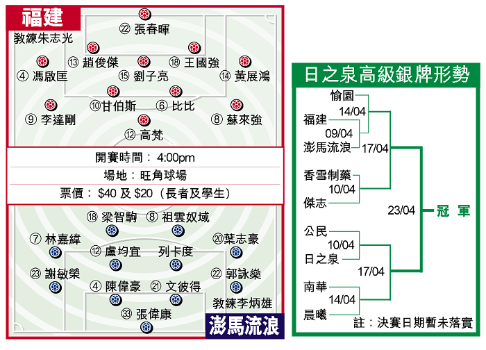 他說:「我們尚餘四場聯賽,而陣中不少球員有黃牌在身,如再領牌將影響餘下幾場護級生死戰的調動,此戰踢來多少有點避忌。我們近兩季對流浪表現與戰績不俗,且看此戰能否發揮水準。」論實力,流浪確實佔先,只是該隊向來不擅強攻,而福建在屯重兵於防線,且看來流浪如何撕破密集。
